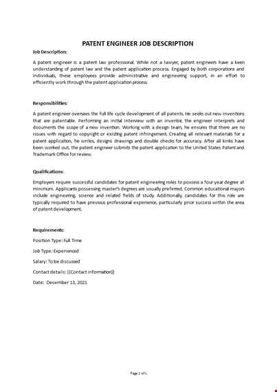 An effective Patent Engineer job description is vital when finding suitable job candidates. No need to start from scratch. By making use of this sample job description template you will make it easier for yourself and you will have a head start.