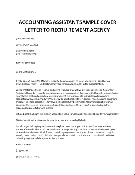Are you looking to apply for a job as an Accountant Assistant? When writing a Accountant Assistant cover letter remember to present your relevant work history and skills according to the job you are applying for. Whether you're seeking an entry-level position or have been in your career for a few years, exposing your relevant achievements in your cover letter can allow you to stand out and get that job interview. Especially when sending it in to a recruitment agency.