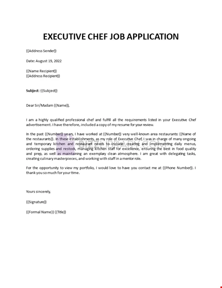 I am a highly qualified professional chef and fulfill all the requirements listed in your Executive Chef advertisement. I have therefore, included a copy of my resume for your review. In the past {{Number}} years, I have worked at {{Number}} very well-known area restaurants: {{Name of the restaurants}}. In these establishments, as my role of Executive Chef, I was in charge of many ongoing and temporary kitchen and restaurant needs to include: creating and implementing daily menus, ordering supplies and restock, managing kitchen staff for excellence, ensuring the best in food quality and prep, as well as maintaining an exemplary clean atmosphere. I am great with delegating tasks, creating culinary masterpieces, and working with staff in a mentor role. For the opportunity to view my portfolio, I would love to have you contact me at {{Phone Number}}. I thank you so much for your time.