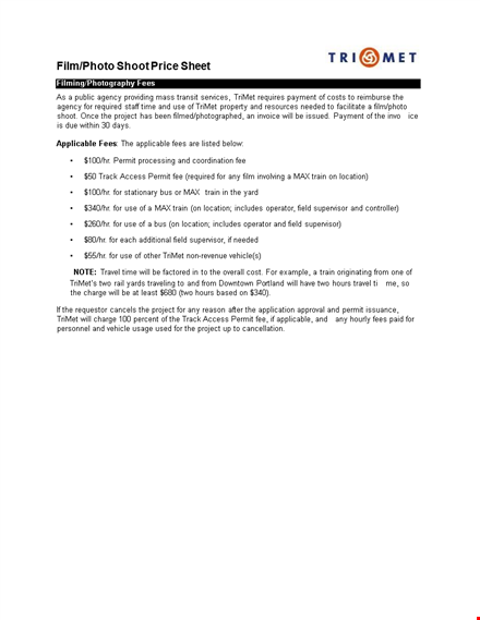 Free Film Photo Shoot Price Sheet PDF Template - Download Now