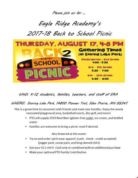 - Supported by PTO and Eagle Era: Show your commitment to the community by involving organizations such as the PTO (Parent-Teacher Organization) and Eagle Era (if applicable) in your event. Our picnic flyer template can include their logos, highlighting their support and involvement.