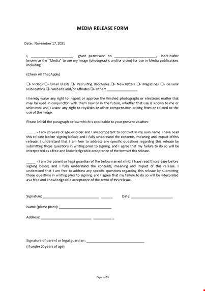 This Media Release Form contains the necessary information to execute the general release. Download this Media Release form template now to deal or prevent future problems.