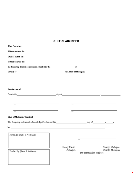 - Accuracy and Compliance: Our Quit Claim Deed Template is carefully crafted to comply with Michigan's laws and regulations. By using our template, you can have confidence that you're creating a valid and legally enforceable document.