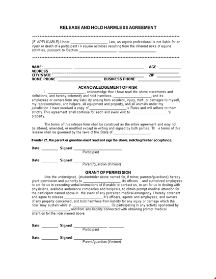 Download Hold Harmless Agreement Template for Participant Release and Protection, Signed and Above