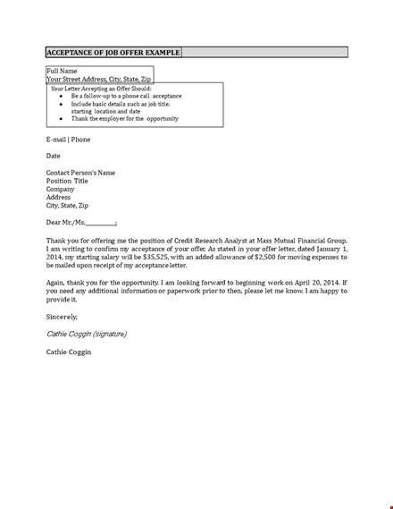 Job Acceptance Letter - Secure Your Offered Position and Express Gratitude Once Again, Cathie