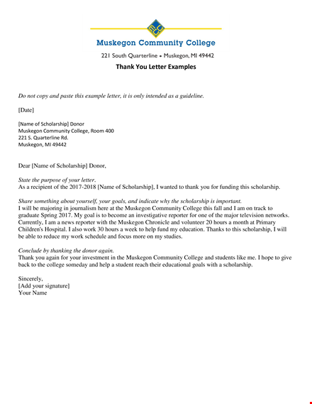 We have compiled some excellent Thank You Letter Examples specifically tailored to express gratitude for scholarship funding from Muskegon College. Our examples contain guidelines and can help you structure your Thank You Letter in a professional manner. The letters are available in PDF format and can be downloaded directly from our website.