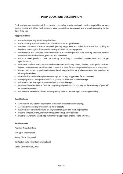Get this printable file now and personalize it according to your needs. Just download this ready-made Prep Cook job description template in Google Docs, MS Word or Apple Pages format and you are ready to go!