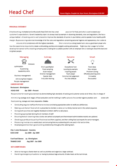 - Highlight Your Skills: It includes dedicated sections to showcase your key culinary skills and areas of expertise, such as menu development, kitchen management, and culinary creativity.