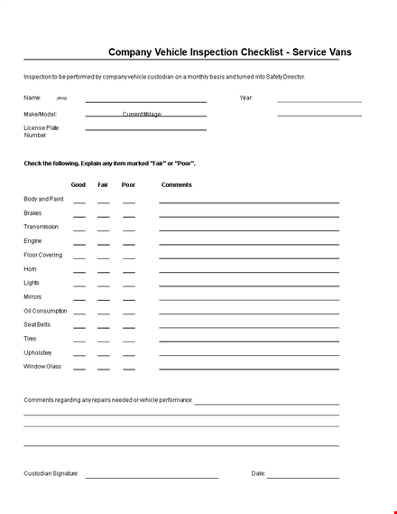 Your Company Vehicle Checklist template covers critical components to inspect and document. Here are some key elements it may include: