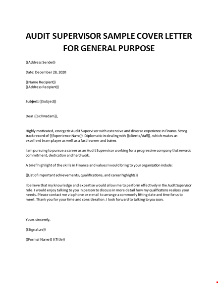 - I believe that my knowledge and expertise would allow me to perform effectively in the Audit Supervisor role. I would enjoy talking to you in person to discuss in more detail how my qualifications realize your needs.