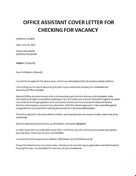 Dear Sir/Madam {{Name}}, I would like to apply for the above post, which I saw advertised on the {{Company name}} platform. I am writing you to inquire about any job jobs in your esteemed company for a dedicated and determined Office Assistant. Reputed Office Assistant armed with a commanding track record in Business Administration within fast-paced and highly competitive landscapes. You will notice one common thread throughout my career: I am a lateral-thinking negotiator and issue solver who knows how to pinpoint needs and achieve division and company-wise business objectives. With this vibrant approach, I have successfully gained recognition for consistent first-ranking achievements in Business Administration. The following skills in Business Administration and characteristics are reason to take a closer look at my credentials: {{List of important achievements, qualifications, and career highlights}} In order to present my credentials more fully, I will follow up with a call to you to answer any inquiries you may have. Thank you for your consideration. I enclose the following names as referees:{{Reference 1}} and {{Reference 2} Please find attached my curriculum vitae. I thank you for considering my application and look forward to hearing from you.I am available for interview at your convenience. Yours sincerely