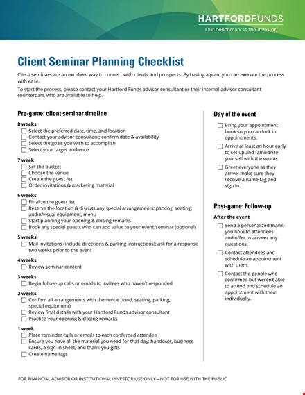 - Coordinate with Clients and Advisors: A seminar involves coordinating with both clients and advisors. A checklist helps you manage all communications, follow-ups, and preparations to ensure everyone is on the same page.