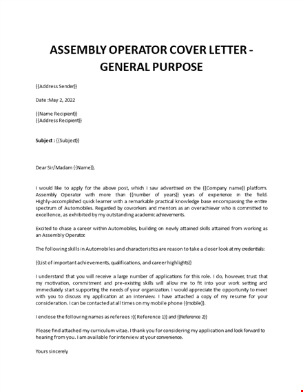 Dear Sir/Madam {{Name}},I would like to apply for the above post, which I saw advertised on the {{Company name}} platform. Assembly Operator with more than {{number of years}} years of experience in the field. Highly-accomplished quick learner with a remarkable practical knowledge base encompassing the entire spectrum of Automobiles. Regarded by coworkers and mentors as an overachiever who is committed to excellence, as exhibited by my outstanding academic achievements.Excited to chase a career within Automobiles, building on newly attained skills attained from working as an Assembly Operator.The following skills in Automobiles and characteristics are reason to take a closer look at my credentials:{{List of important achievements, qualifications, and career highlights}}I understand that you will receive a large number of applications for this role. I do, however, trust that my motivation, commitment and pre-existing skills will allow me to fit into your work setting and immediately start supporting the needs of your organization. I would appreciate the opportunity to meet with you to discuss my application at an interview. I have attached a copy of my resume for your consideration. I can be contacted at all times on my mobile phone {{mobile}}.I enclose the following names as referees :{{ Reference 1}} and {{Reference 2}}Please find attached my curriculum vitae. I thank you for considering my application and look forward to hearing from you. I am available for interview at your convenience.Yours sincerely