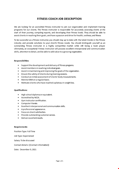 This sample Fitness Coach Job description explainer offers guidance on key sections that are important to include for clarity, as well as suggestions for promoting the position. It provides a list of duties, responsibilities, tasks, requirements, demands for setting job expectations and the employee's ability to perform the work as described. However, it’s often not construed as an exhaustive list of all functions, responsibilities, skills and abilities.