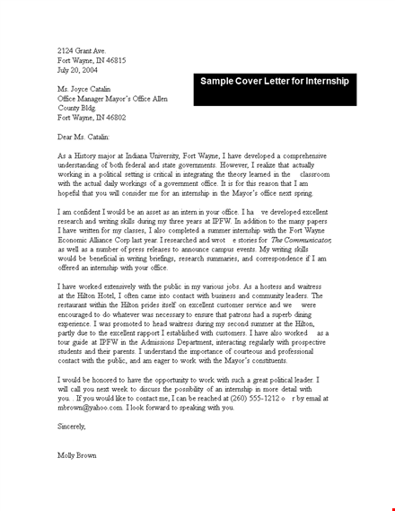 Are you searching for the perfect internship opportunity in Fort Wayne? Look no further! BizzLibrary.com has a variety of resources available to help you in your search. Our Sample Cover Letter for an Internship is designed to assist you in crafting a professional cover letter for your dream internship with the mayor's office. Download our Sample Cover Letter for Internship now and take the first step towards your future career!