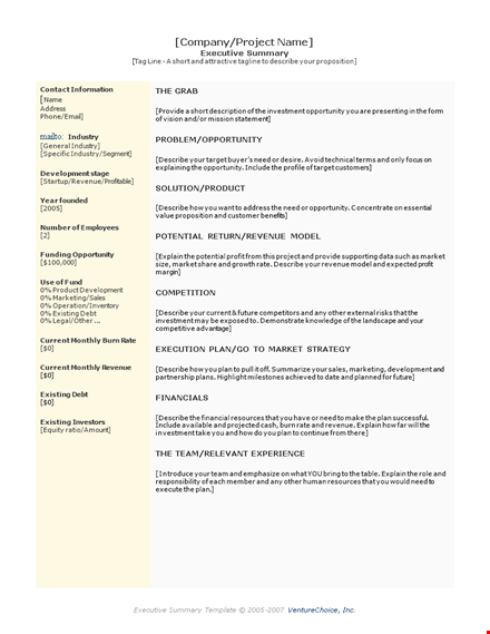 - Structure: With the Executive Summary Template, you can structure your report in a logical and compelling way, ensuring that you address the key questions that potential investors or stakeholders may have. It also helps you to identify any gaps in your plan and refine your messaging.