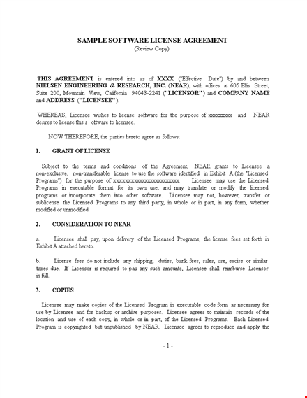 - Payment Terms: The agreement should specify the fees, royalties, or other financial considerations involved in obtaining the software license. It should also outline the payment schedule and any late payment penalties, if applicable.
