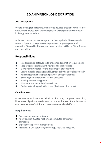 Download the complete 2D animation job description in MS word file. Don’t forget to share with your colleagues in need. Head towards bizzlibrary.com for more useful documents.