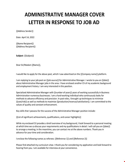 Dear Sir/Madam {{Name}},I would like to apply for the above post, which I saw advertised on the {{Company name}} platform.I am replying to your job post on {{job source}} for Administrative Manager. I wrote to you on {{date}} about Administrative Manager jobs in the area. I have enclosed another CV of my academic background and employment history. I am very interested in this position.Specialized Administrative Manager with {{number of years}} years of working successfully in Business Administration in numerous businesses. I am a hard-working individual who continuously looks for methods to advance efficiency and precision. In past roles, I brought up techniques to minimize {{cost/risk}} as well as methods to maximize {{production/revenue/satisfaction}}. I am committed to the values of quality and constant enhancement.Key skills that I possess for the success of the Administrative Manager position include:{{List of significant achievements, qualifications, and career highlights}}While my enclosed CV provides a brief overview of my background, I look forward to a personal meeting at which time we ca discuss your requirements and my qualifications in detail. I will call you on {{date}} to arrange a meeting; in the meantime, you can contact me at the above numbers. Thank you in advance for your time and consideration.I enclose the following names as referees: {{Reference 1}} and {{Reference 2}}Please find attached my curriculum vitae. I thank you for considering my application and look forward to hearing from you. I am available for an interview at your convenience.Yours sincerely