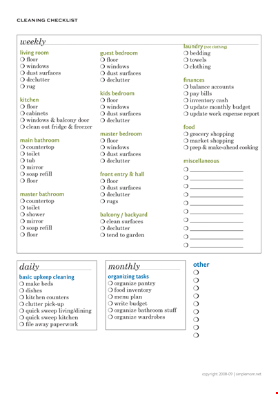 - Stress Reduction: Knowing exactly what needs to be done each week can alleviate the stress of cleaning. With a checklist, you can easily track your progress and feel a sense of accomplishment as you check off completed tasks.