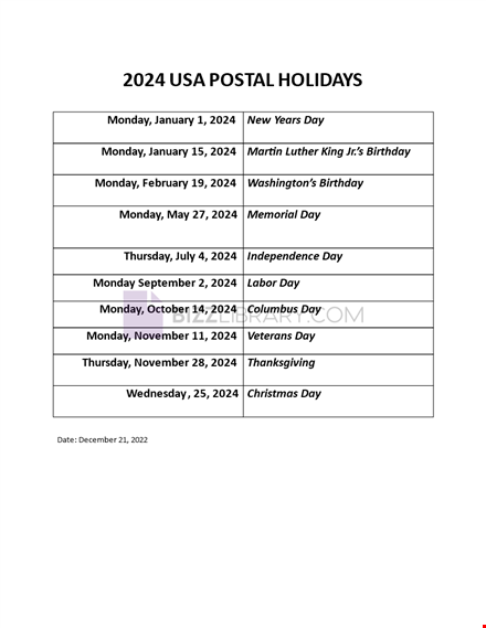 Postal holidays 2024 USA