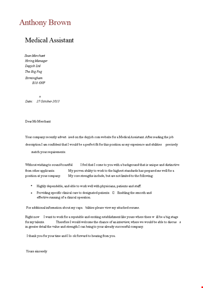 - Showcase Your Skills: Your cover letter allows you to provide specific examples of your skills and how they align with the requirements of the medical assistant position. It gives you a chance to demonstrate your ability to perform administrative tasks, handle patient records, and provide support to healthcare professionals.