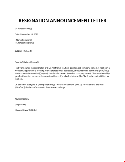 - I sadly announce the resignation of Mr/Mrs {{name}} from his/her position at the company name.