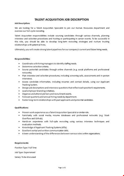 Since well defined descriptions will attract more suitable candidates for the position, we recommend you to use this Talent Acquisition job description sample. Customize it according to your needs, and then publish it directly to your page and network, you will soon start receiving Resumes and Cover letter from qualified candidates. This Talent Acquisition Job Description template is fully customizable and can be used in Google Docs, MS Word format. Get this printable file now and personalize it according to your needs. If this is not the job description that fits your need, also have a look at many of our other examples of job description templates here.