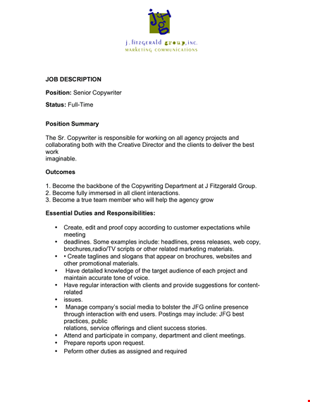 Visit our website now and download the Senior Copywriter Job Description in PDF format. Take the first step towards an exciting and rewarding career as a Senior Copywriter.