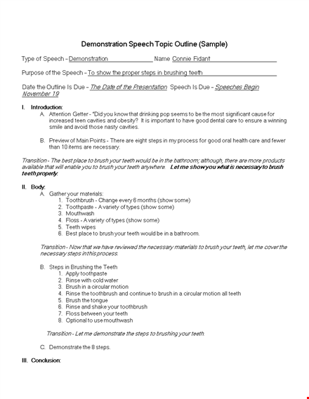 If you have been assigned to deliver a demonstration speech and are looking for some guidance, you've come to the right place! At BizzLibrary.com, we provide a comprehensive Demonstration Speech Sample Outline that will help you organize and deliver an effective presentation. Whether you are demonstrating how to brush your teeth or showcasing a step-by-step process, our sample outline will serve as an excellent starting point for your speech.