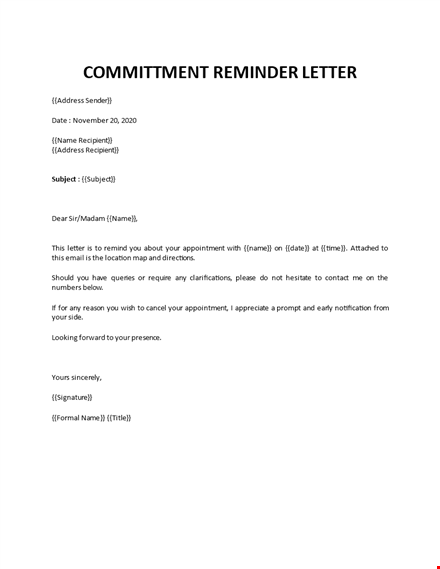 - I am writing to remind you about your appointment with {{person or group of people}} on {{date}} at {{location}}.