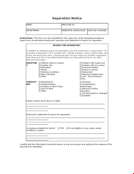 - Reason for Separation: The notice may include a brief explanation of the employee's reason for leaving voluntarily, which can be valuable information for the employer in terms of understanding employee satisfaction and making improvements.