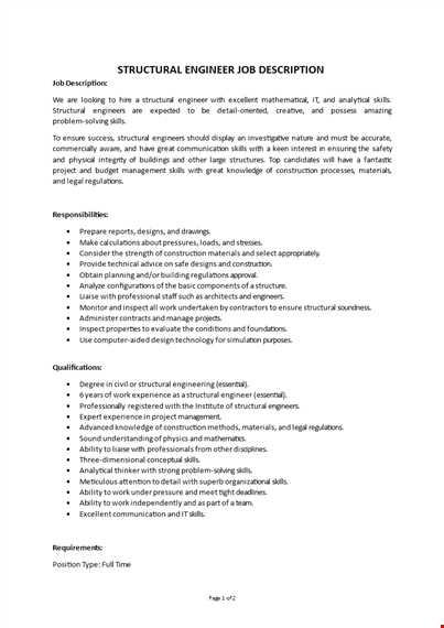 Since well defined descriptions will attract more suitable candidates for the position, we recommend you to use this Structural Engineer job description sample. Customize it according to your needs, and then publish it directly to your page and network, you will soon start receiving Resumes and Cover letter from qualified candidates. This Structural Engineer Job Description template is fully customizable and can be used in Google Docs, MS Word format. Get this printable file now and personalize it according to your needs. If this is not the job description that fits your need, also have a look at many of our other examples of job description templates here.