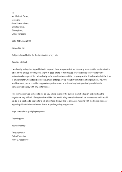 - Compose Your Appeal Letter: Use our Job Termination Appeal Letter template, available for download in DOCX format, to create a well-structured and persuasive letter. Address it to the appropriate company manager or HR representative and clearly state that you are appealing your termination.