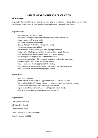 Shippers Warehouse Job Description