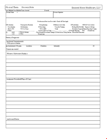 Maximize your efficiency and ensure comprehensive documentation with our Physical Therapy Progress Note Template in DOCX format. Simplify your note-taking process, enhance patient care, and streamline billing procedures.
