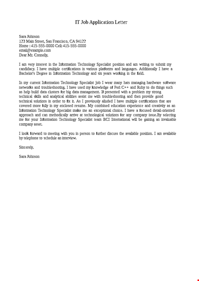 - Your Qualifications: Highlight your relevant qualifications, skills, and experiences that make you a suitable candidate for the IT specialist position. Be specific and provide examples to demonstrate your expertise in areas such as system administration, network management, cybersecurity, programming languages, etc.