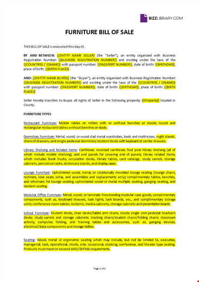 This sample Bill of sale can be used between a buyer and seller for the purchase or sale of new or second-hand furniture and fixtures. It's always best to create a Bill of Sale when you are selling or buying such items, so you are able to put some terms and conditions on paper.