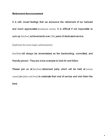 Retirement Announcement Template - Celebrating Your Service and Achievements