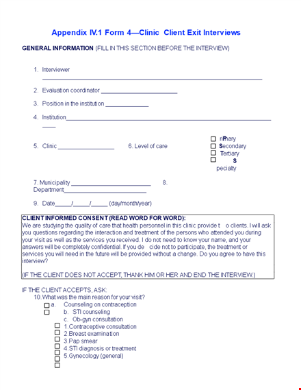 Are you a healthcare provider or clinic looking to gather valuable feedback from your clients? Conducting client exit interviews can provide insights into your service quality and help identify areas of improvement. To make this process easier for you, we offer a professionally designed Client Exit Interview template in DOCX format that you can download and customize to suit your needs.