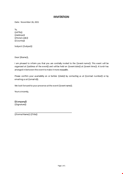 I am pleased to inform you that you are cordially invited to the {{event name}}. This event will be organized at {{address of the event}} and will be held on {{event date}} at {{event time}}. Lunch has been arranged in between the event to make it more enjoyable.
