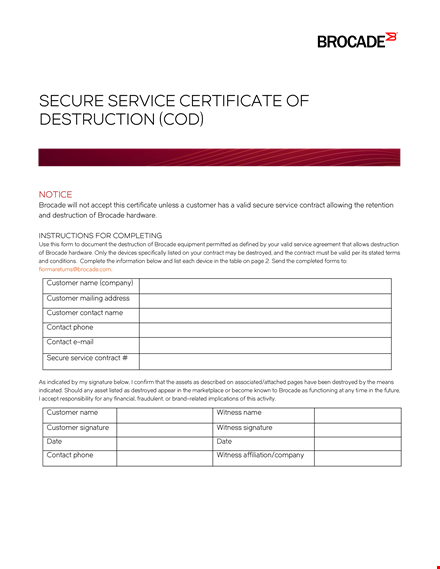 Service Certificate Of Destruction Template | Customer Contract | Brocade Destruction Service