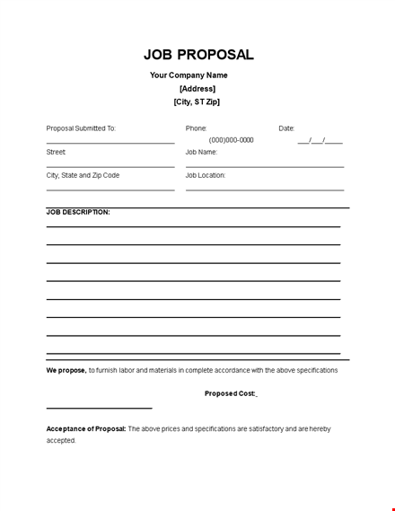 - User-Friendly: Our Job Proposal Template is easy to use and customize to meet your specific needs. You can quickly add your own company name, city, zip, date, and other details that will make your proposal stand out.