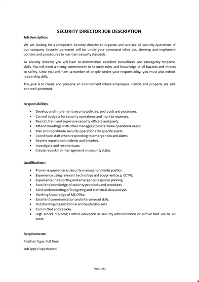 Since well defined descriptions will attract more suitable candidates for the position, we recommend you to use this Security Director job description sample. Customize it according to your needs, and then publish it directly to your page and network, you will soon start receiving Resumes and Cover letter from qualified candidates. This Security Director Job Description template is fully customizable and can be used in Google Docs, MS Word format. Get this printable file now and personalize it according to your needs. If this is not the job description that fits your need, also have a look at many of our other examples of job description templates here.