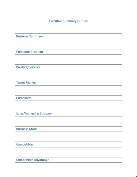 - Outline of Key Information: Our Executive Summary Template is designed to provide an outline of the key information that you need to include in your summary. It will help you to identify and focus on the most critical aspects of your business plan or proposal.