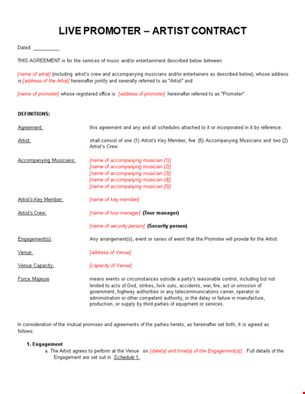- Clear Identification: The contract clearly identifies the artist and the promoter involved in the collaboration. It includes their names, contact information, and any associated entities, ensuring that both parties are accurately represented.