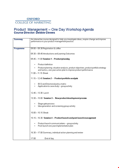 One Day Workshop Agenda - Management, Product Planning, Session, Launch