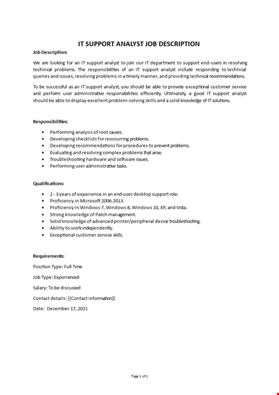 Get this printable file now and personalize it according to your needs. Just download this ready-made IT Support Analyst job description template in Google Docs, MS Word or Apple Pages format and you are ready to go!