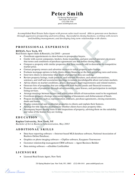 - Showcase New York Real Estate Experience: If you have specific experience in the New York real estate market, make sure to highlight it on your resume. Mention any relevant certifications or licenses specific to New York, as well as your knowledge of the local market.