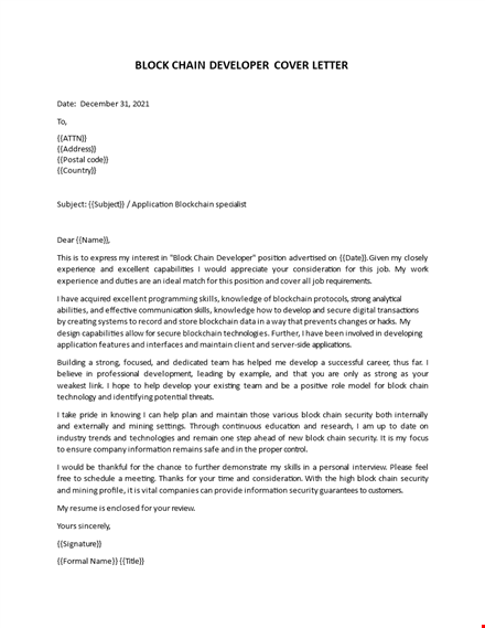 This is to express my interest in "Block Chain Developer" position advertised on {{Date}}.Given my closely experience and excellent capabilities I would appreciate your consideration for this job. My work experience and duties are an ideal match for this position and cover all job requirements.